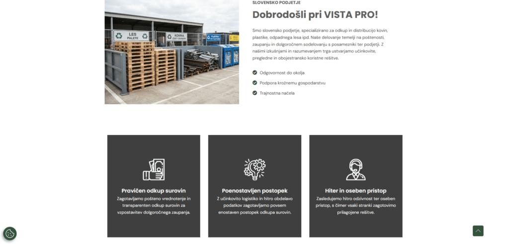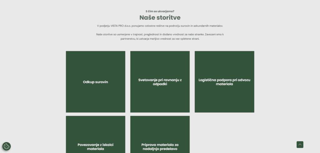 Za podjetje VISTA PRO d.o.o. smo zasnovali in izdelali sodobno spletno stran, ki obiskovalcem na pregleden način predstavi storitve, način dela ter omogoča enostaven stik. Poseben poudarek smo namenili prijazni in čisti vizualni podobi, ki odraža skrb za okolje in zaupanje.